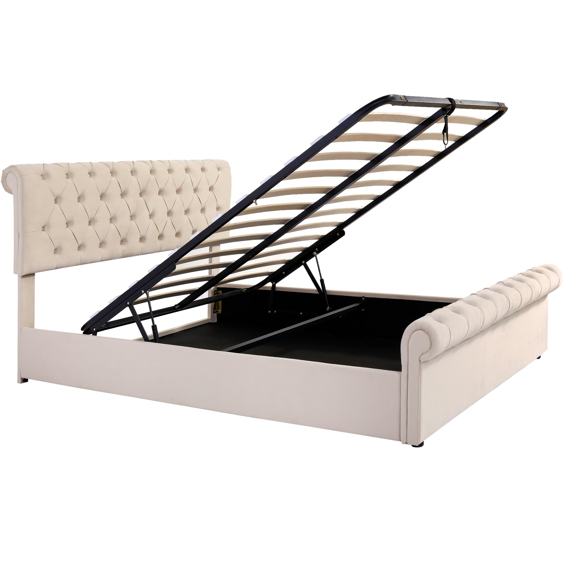 King Size Velvet Button-Tufted Ottoman Sleigh Bed in Neutral Beige