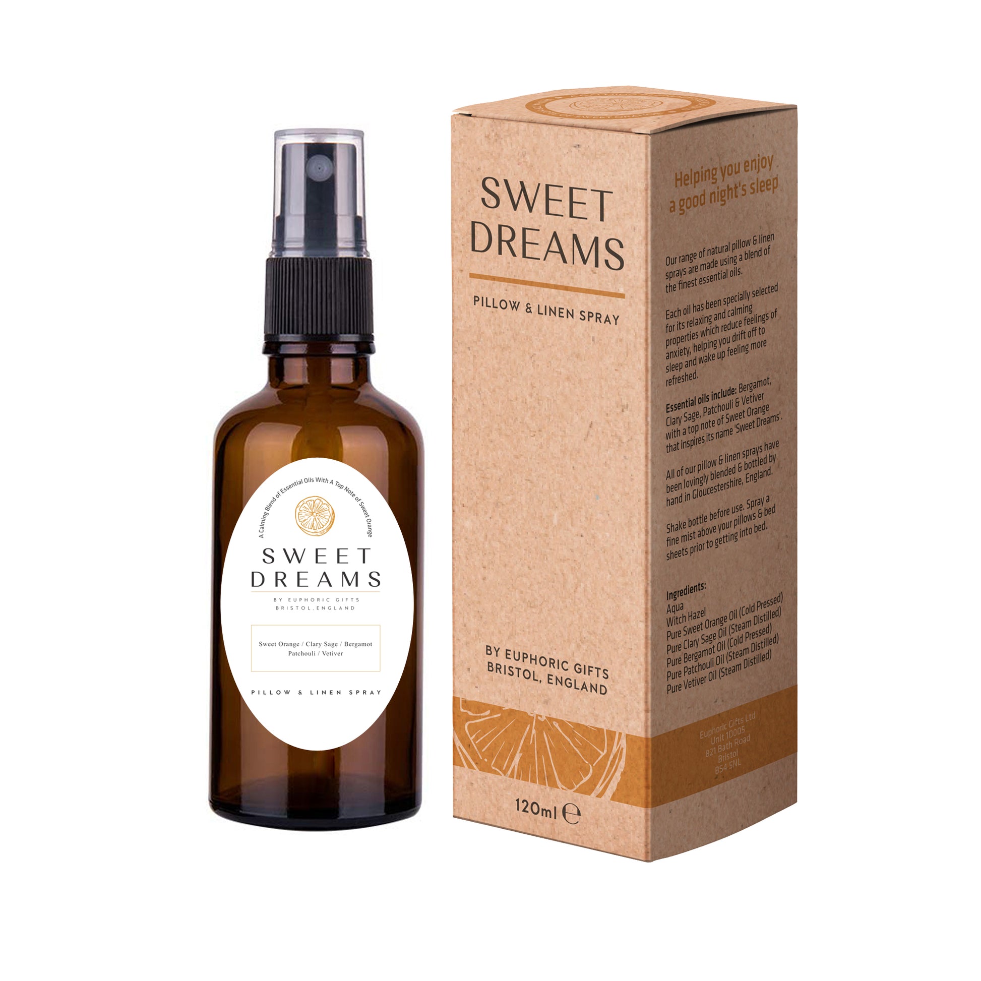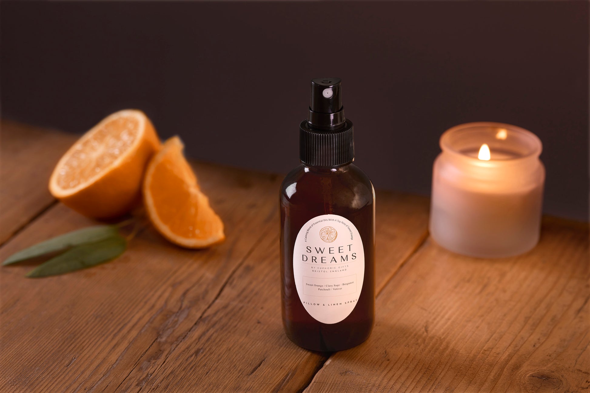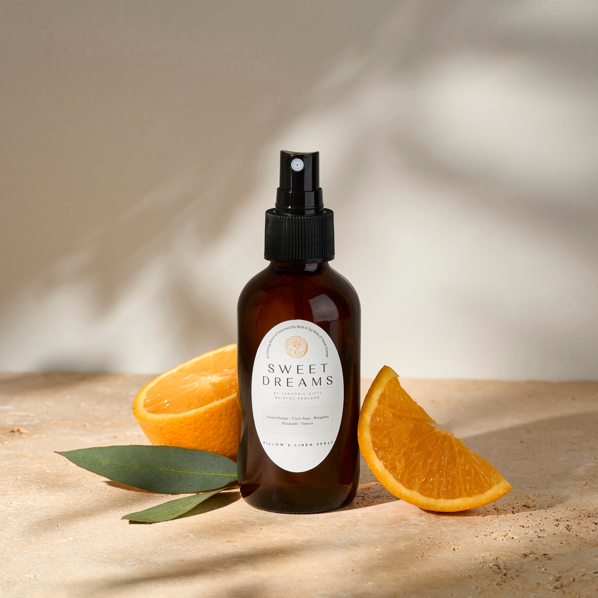 Sweet orange essential oil has traditionally been used to calm nervous tension, which means it's great for those looking for a natural solution to quieten a busy mind. We have blended our premium organic 'Sweet Orange Essential Oil' with a number of other calming essential oils to produce this delightful pillow & linen sleep spray called 'Sweet Dreams'.